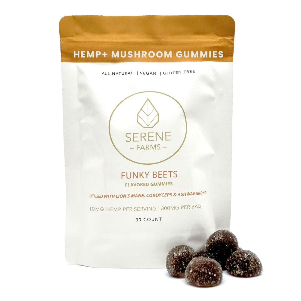 Serene Farms NEW Funky Beets Hemp Extract + Mushroom Infused Gummies are here! Our proprietary blend of functional mushrooms plus organic hemp extract supports mental health while keeping you calm, clear and grounded. Great for day or night time use.