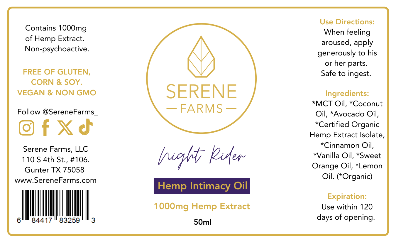 Take the night to new highs with Serene Farms NEW Night Rider Hemp Extract Intimacy Oil. Night Rider creates exciting sensations, stimulates blood flow, lubricates and relieves sexual pain and discomfort.